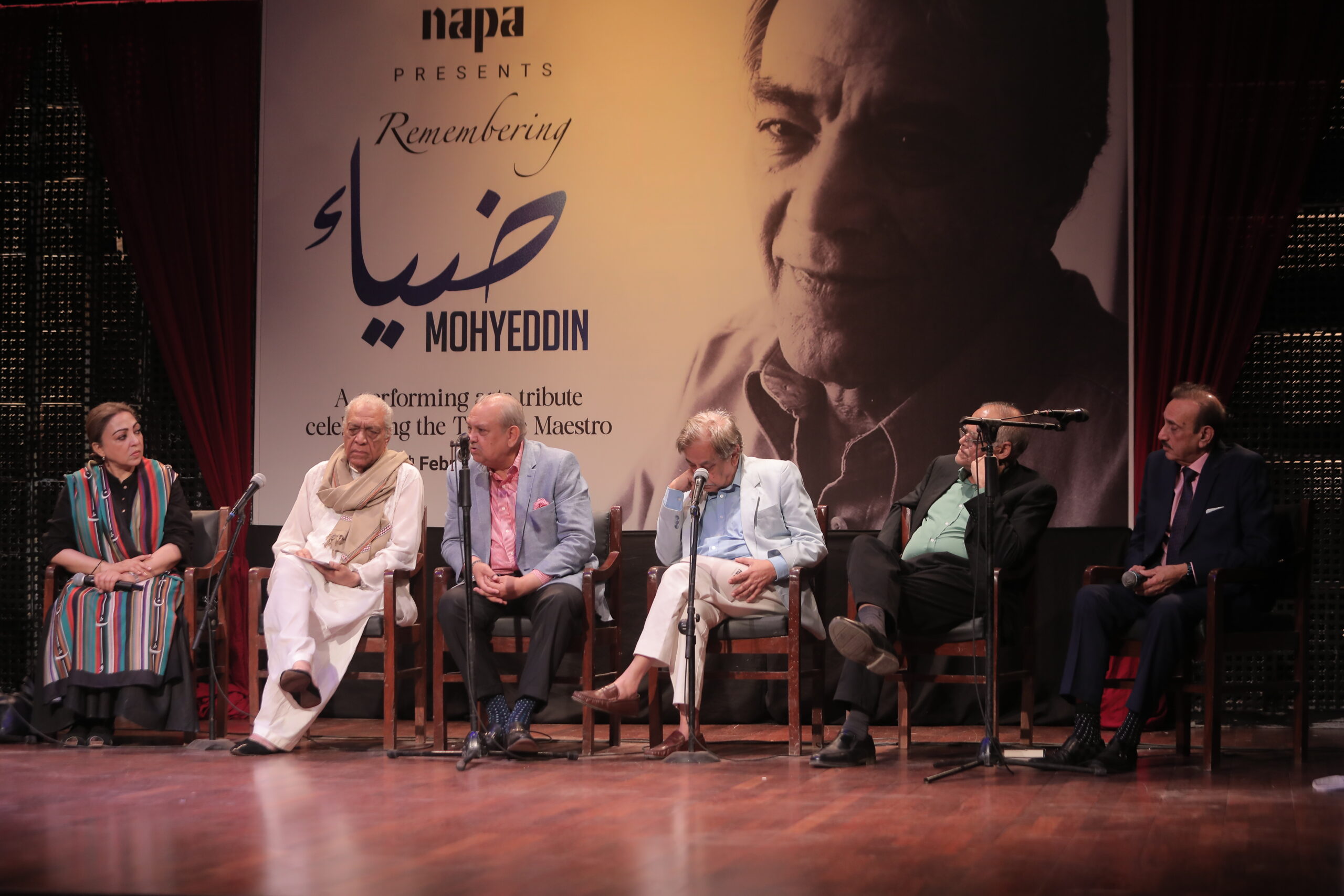 The programme began with a panel discussion with Zia Mohyeddin’s wife Azra, actor and old friend Munawwar Saeed, NAPA Chairperson Syed Jawaid Iqbal, NAPA’s advisor on theatre Khalid Ahmed, former senator Javed Jabbar and poet Ashfaq Hussain. NAPA CEO, Junaid Zuberi conducted the discussion. He said it was difficult to speak on the personality of Zia`Mohyeddin in just one session. The panel he had chosen, decidedly, could speak for hours on the life and achievements of Zia sahib.