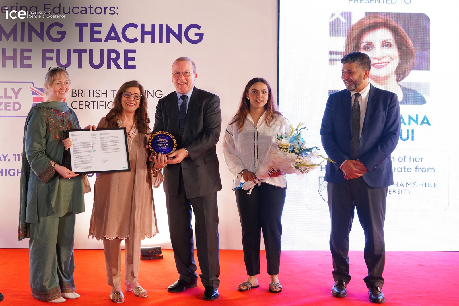 A key highlight of the Karachi event was the presentation of an Honorary Doctorate by Buckinghamshire New University to Ms. Sultana Siddiqui, President Hum Network Limited. This initiative was facilitated by ICE Pakistan who are strong proponents of women empowerment and want international recognition for Pakistanis. This prestigious recognition was awarded in appreciation of her groundbreaking contributions to Pakistan’s media landscape and her role in advancing cultural representation and education through creative platforms.